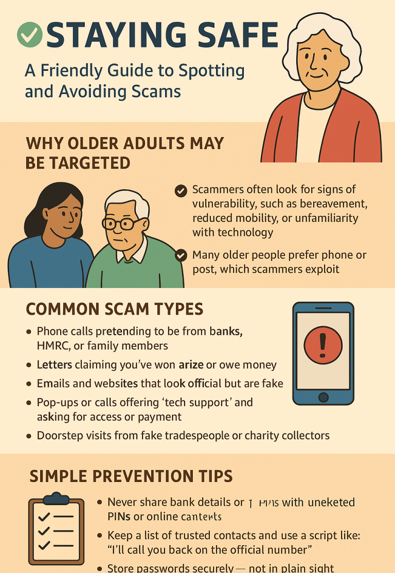 Scams can be upsetting and costly — especially for older adults who may be more trusting or unfamiliar with digital tools. This guide offers gentle, practical advice to help families and carers spot warning signs, prevent harm, and take action if something goes wrong.