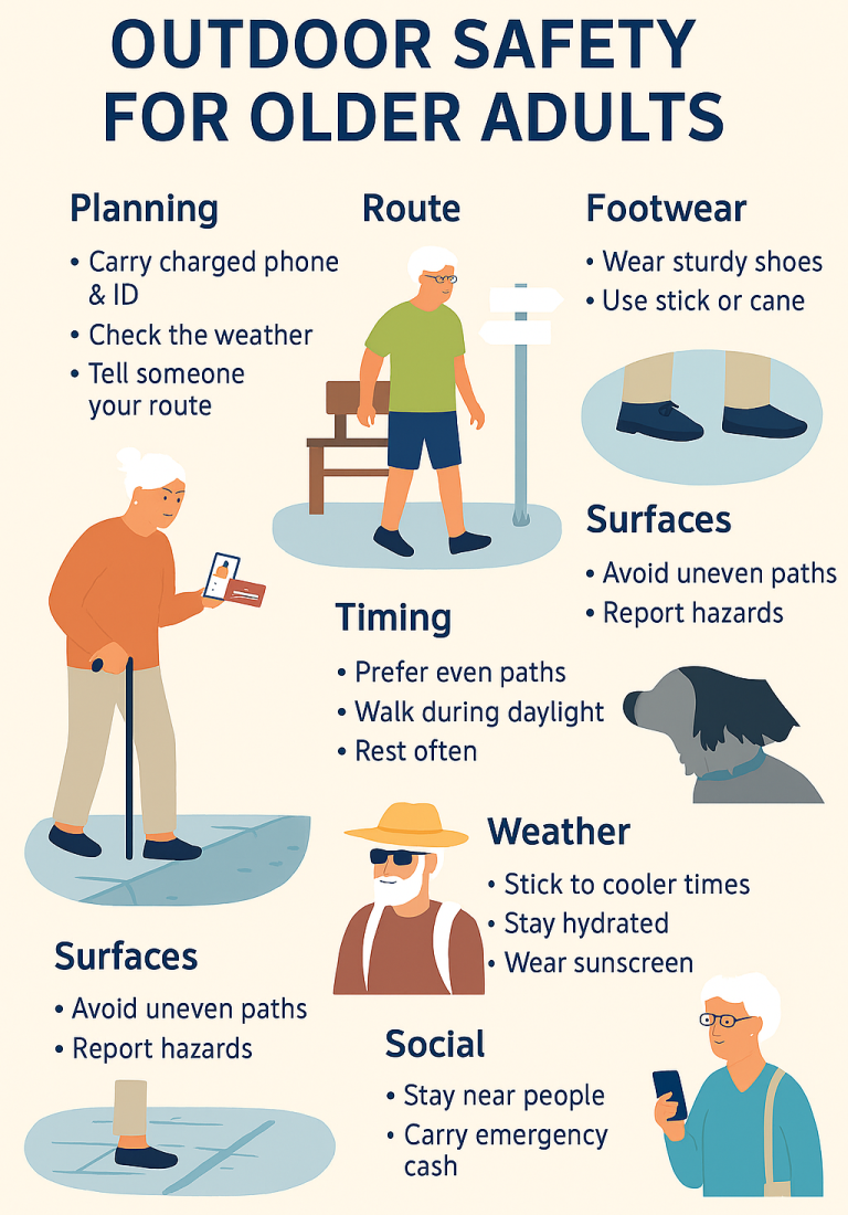 This expanded guide builds on the core tips and adds practical, detailed actions for planning, equipment, environment, travel, activities and community support so older adults can stay active and safe outdoors.